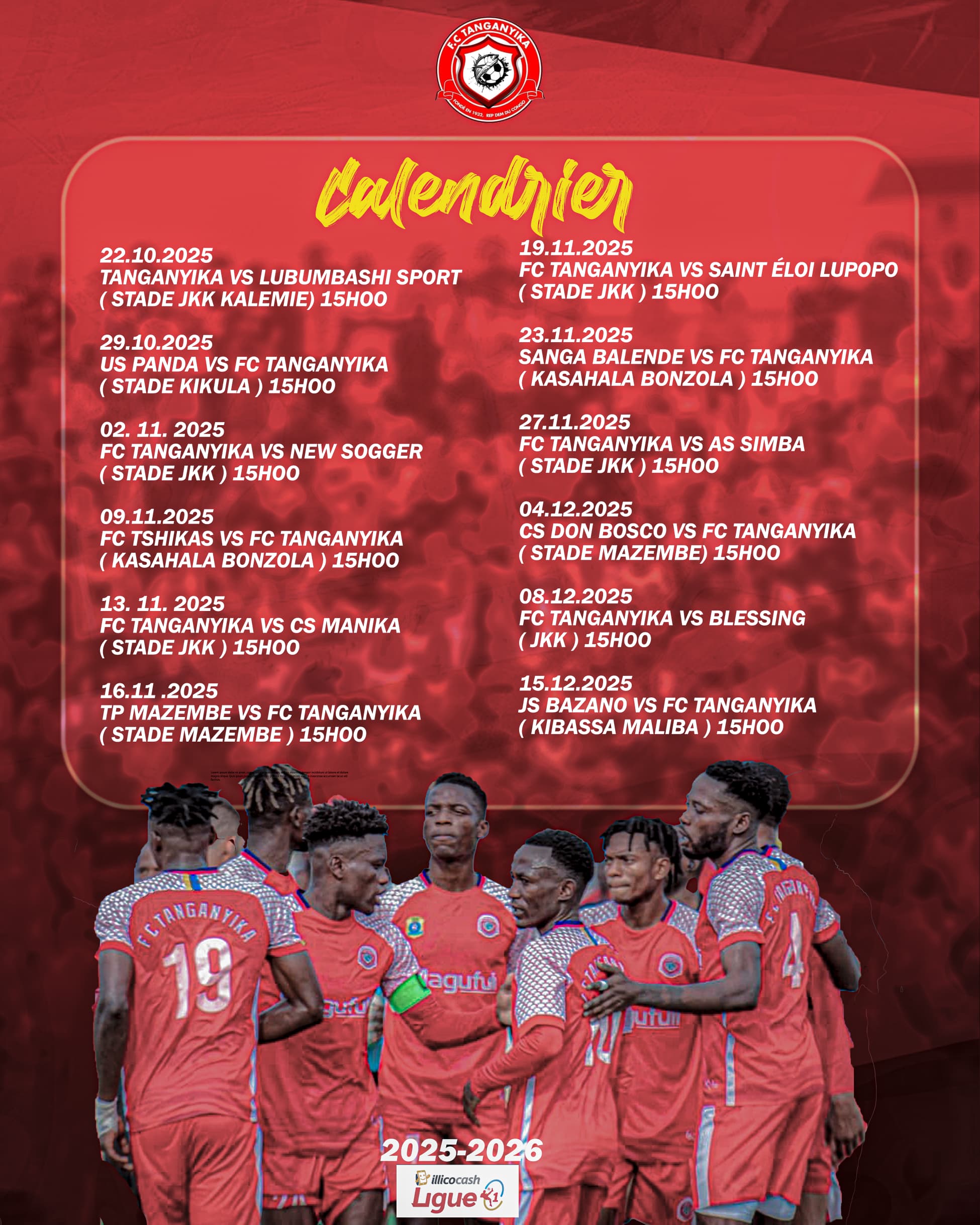 Voici le voici le calendrier complet du FC Tanganyika de Kalemie.