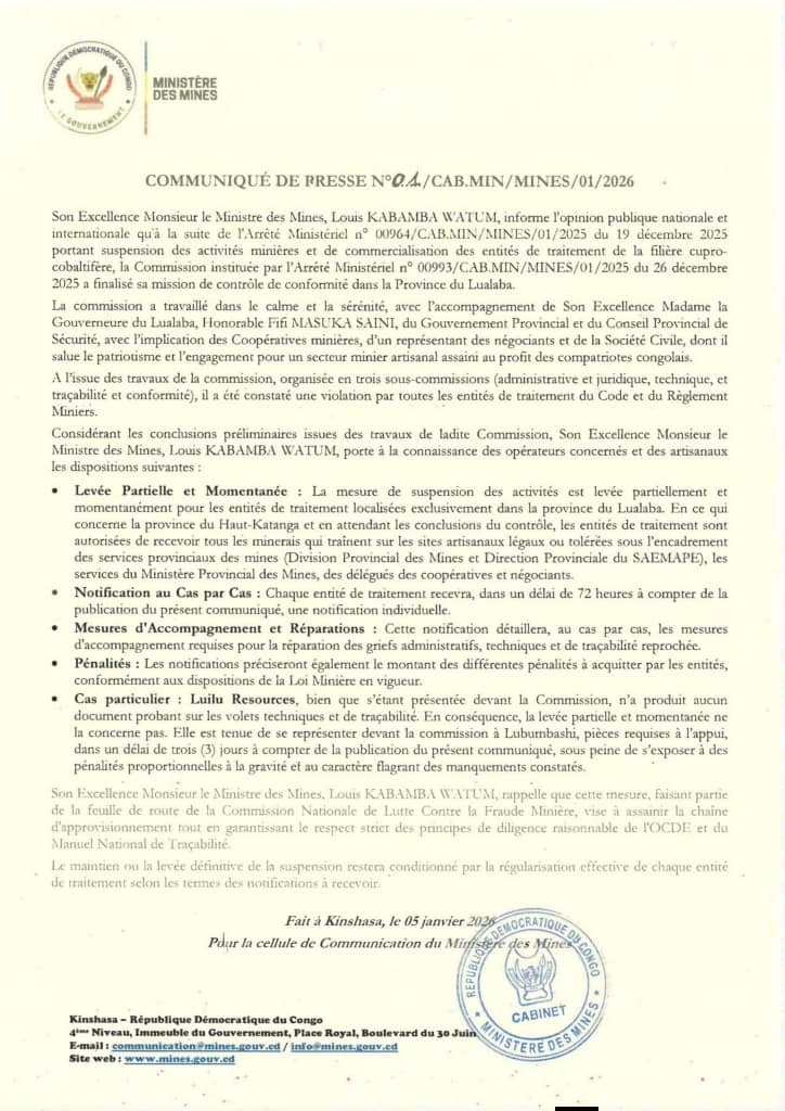 Le Ministre des Mines, Louis KABAMBA WATUM, a annoncé la levée partielle et momentanée de la suspension des activités minières et de commercialisation des entités de traitement de la filière cupro-cobaltifère dans la province du Lualaba.