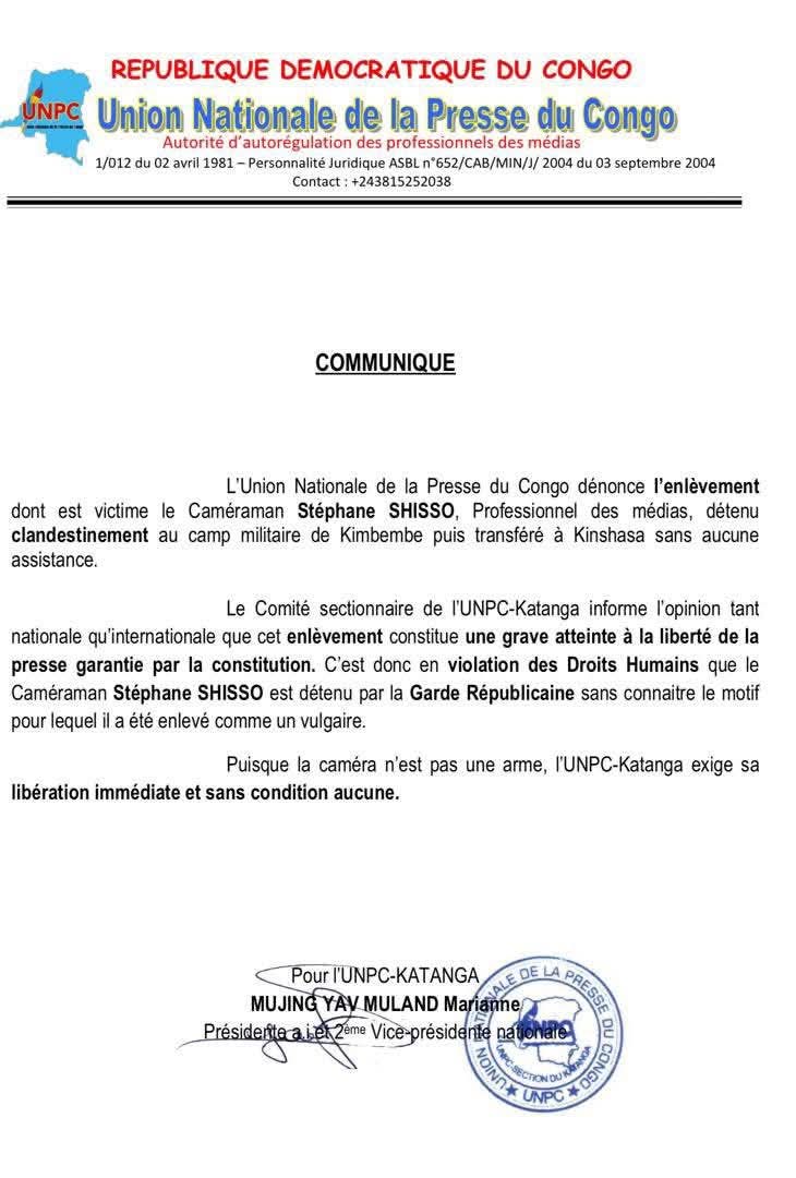 L'Union nationale de la presse du Congo (UNPC) a dénoncé l'enlèvement du cameraman Stéphane Shisso, professionnel des médias, détenu clandestinement au camp militaire de Kimbembe avant d'être transféré à Kinshasa sans aucune assistance. Selon Marianne Mujing Yav, présidente intérimaire de l'UNPC/Katanga, le cameraman est détenu par la Garde Républicaine sans connaître le motif de son arrestation.