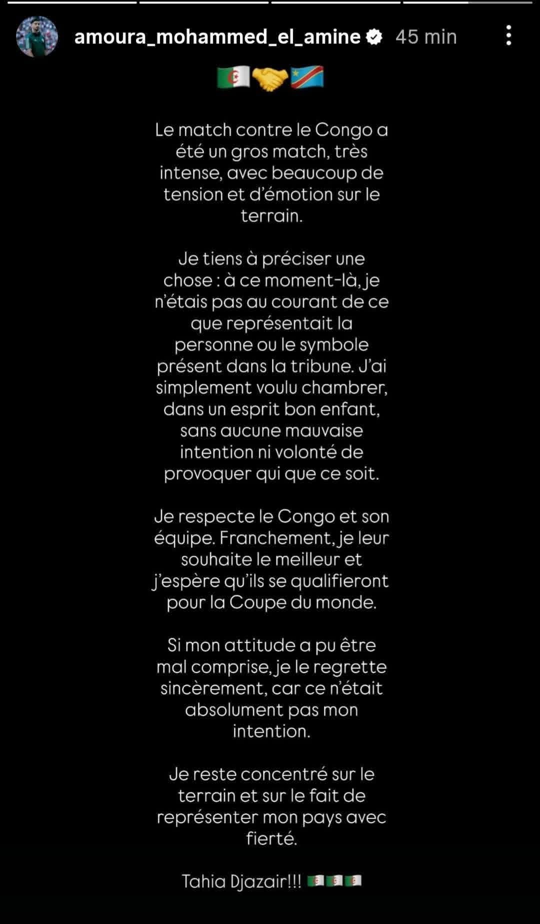 Amoura a assuré avoir agi dans un esprit de plaisanterie, sans intention de provoquer ou de manquer de respect. Il a exprimé son estime pour l'équipe congolaise et a souhaité leur succès futur. "Si mon attitude a pu être mal interprétée, je le regrette sincèrement", a-t-il conclu, terminant par "Tahia Djazair", une expression de soutien à l'Algérie.