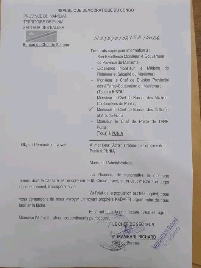 Le chef du secteur Baleka a sollicité l'aide de l'administrateur du territoire de Punia pour envoyer un "voyant" afin de résoudre ce problème mystérieux.