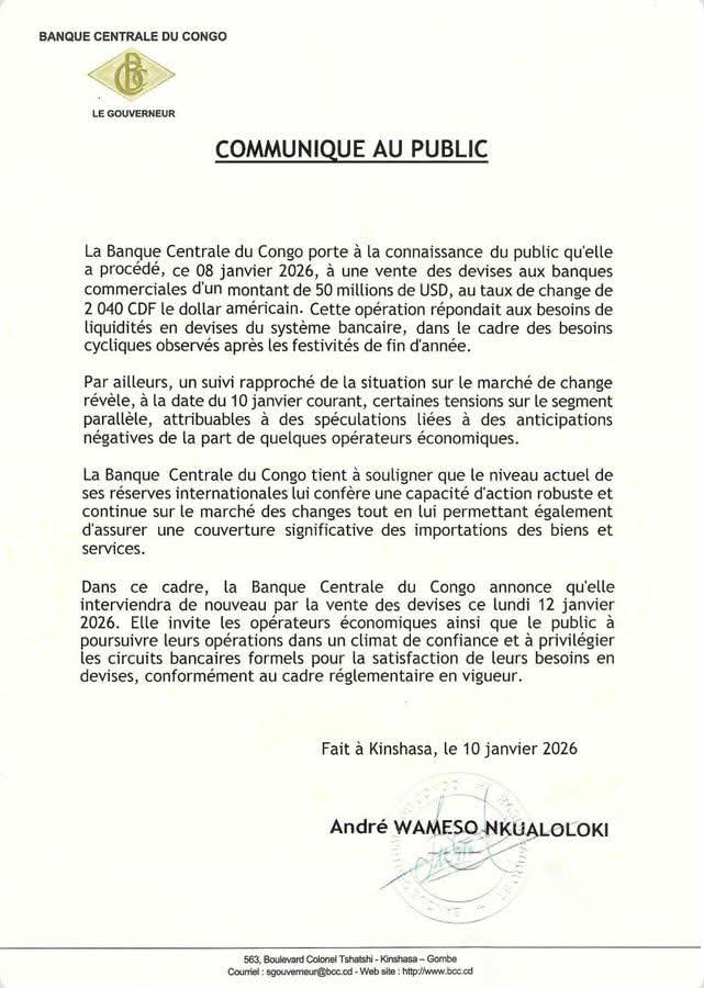 La Banque Centrale du Congo (BCC) va intervenir à nouveau sur le marché des changes ce lundi 12 janvier 2026 pour vendre des devises, après avoir déjà injecté 50 millions de dollars américains le 8 janvier 2026.