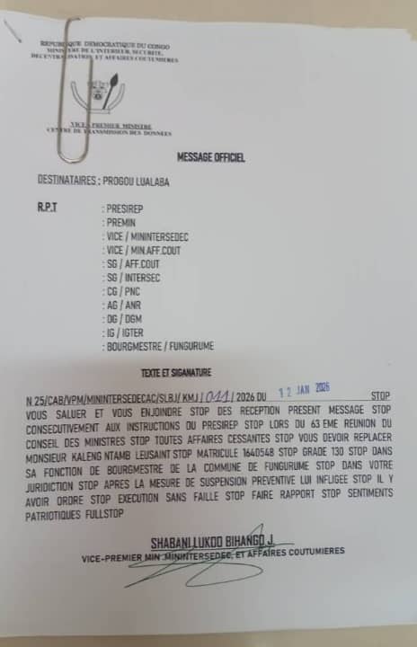 La suspension préventive du bourgmestre de Fungurume, Leusaint Kaleng, a été levée par le Vice-Premier ministre de l'Intérieur, Jacquemin Shabani.