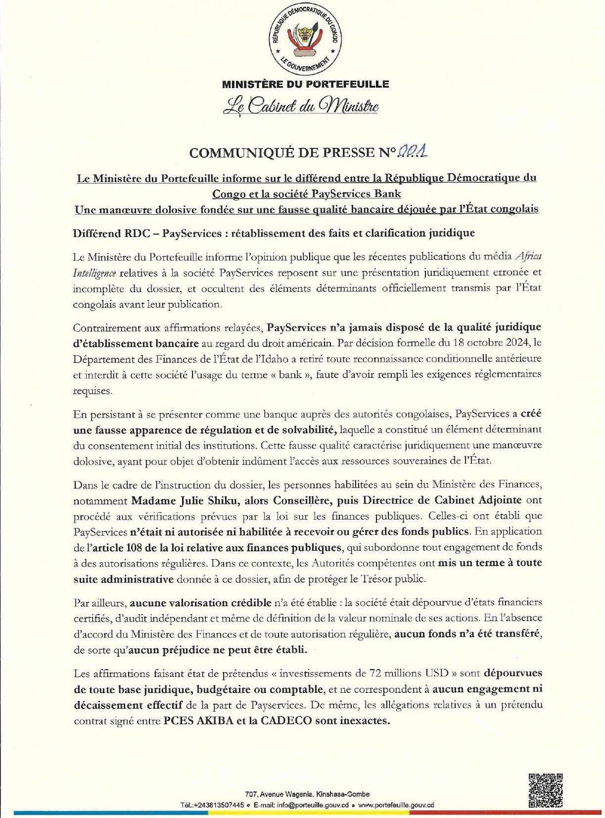 Le ministère du Portefeuille assure que les autorités congolaises continueront à agir avec diligence et responsabilité pour protéger les intérêts du pays.