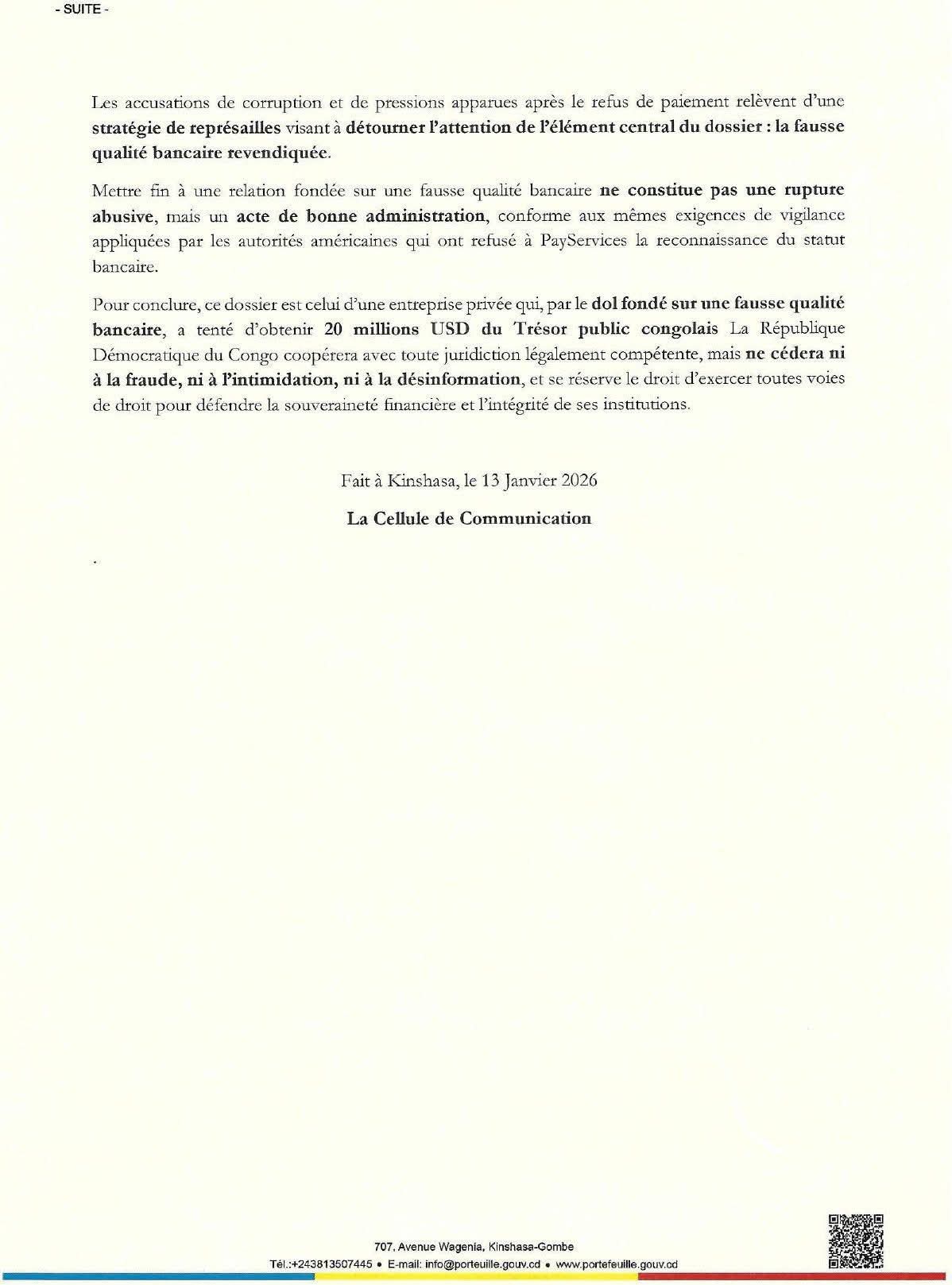 La RDC reste attachée à la transparence, à la bonne gouvernance et à la défense de sa souveraineté financière.