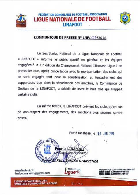Le Secrétariat National de la Ligue Nationale de Football (LINAFOOT) annonce que, suite à une concertation avec les représentants des clubs engagés dans la 31e édition du Championnat National Illicocash Ligue I, la Commission de Gestion de la LINAFOOT a décidé de lever le huis clos qui frappait certains clubs.