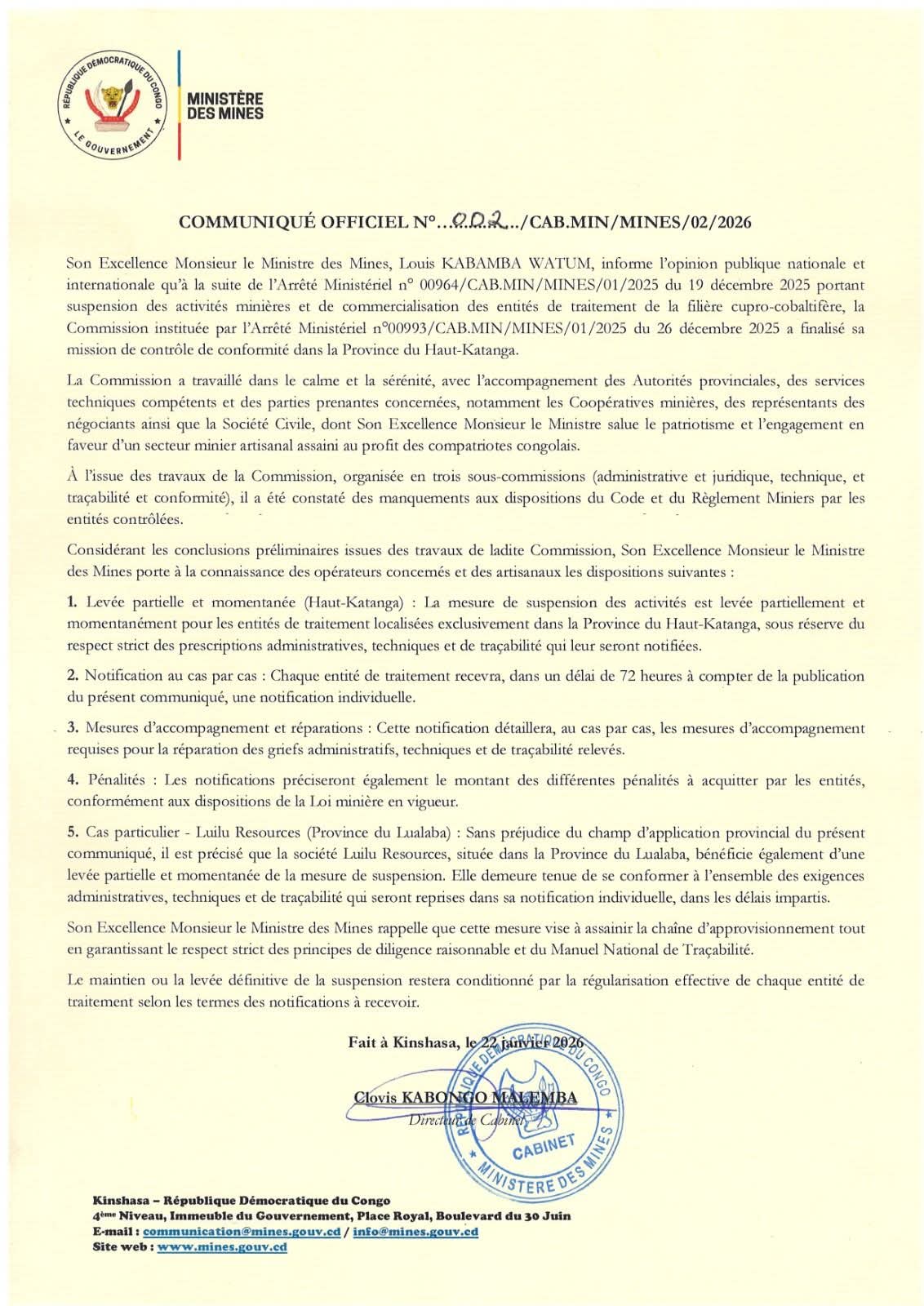 Le Ministre des Mines, Louis KABAMBA WATUM, annonce la levée partielle et momentanée de la suspension des activités minières et de commercialisation des entités de traitement de la filière cupro-cobaltifère dans la Province du Haut-Katanga.