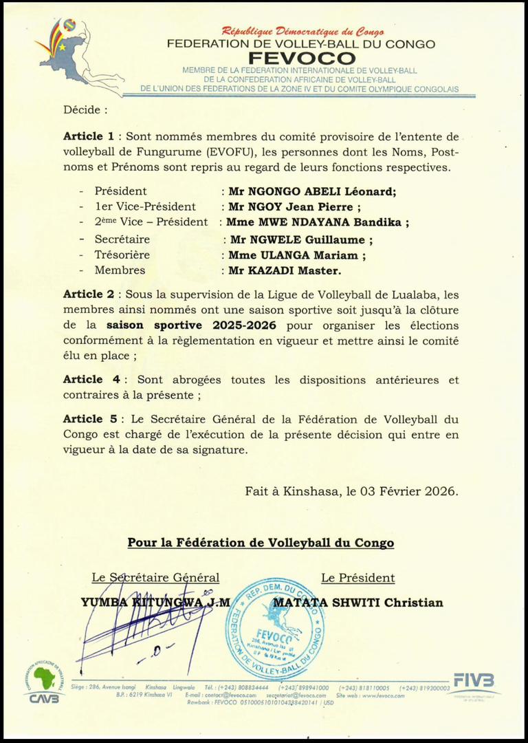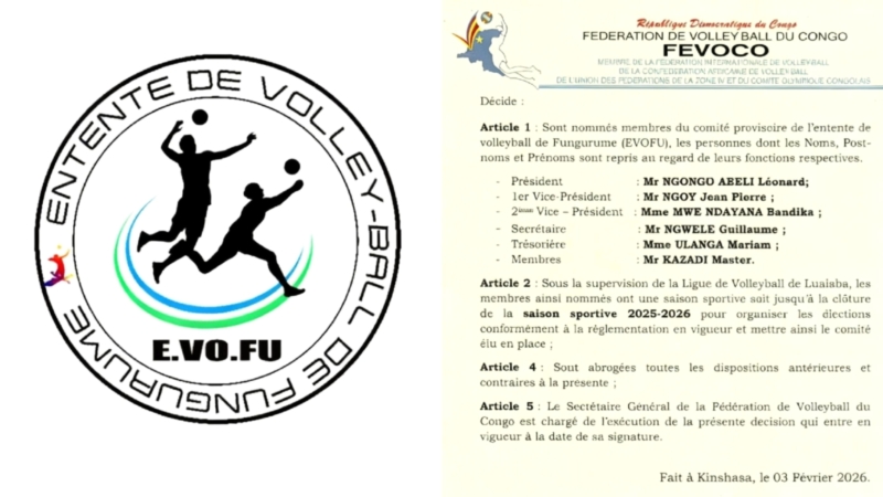 La Fédération de Volleyball du Congo (FEVOCO) a pris une décision importante concernant l'Entente de Volleyball de Fungurume (EVOFU).