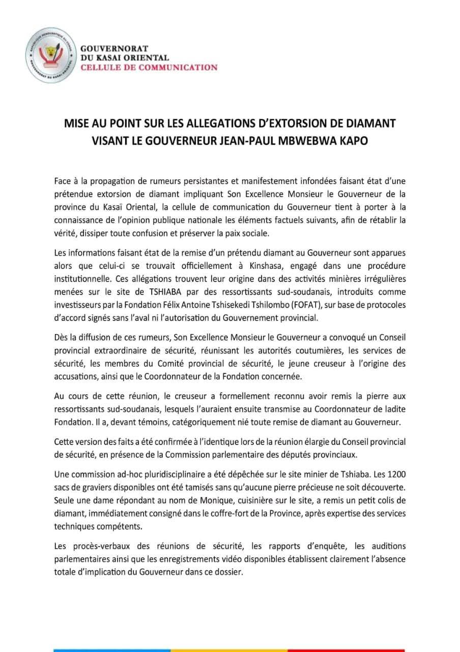 Le cabinet du gouverneur du Kasaï-Oriental a rejeté en bloc les accusations d'extorsion de diamant visant l'autorité provinciale, relayées récemment sur les réseaux sociaux.