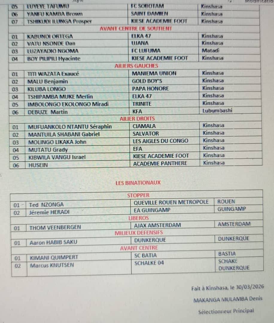 Le sélectionneur principal des Léopards U-17, MAKENGA MULAMBA DÉNIS, a annoncé la liste des joueurs présélectionnés en vue du tour final de la CAN U17 2026.