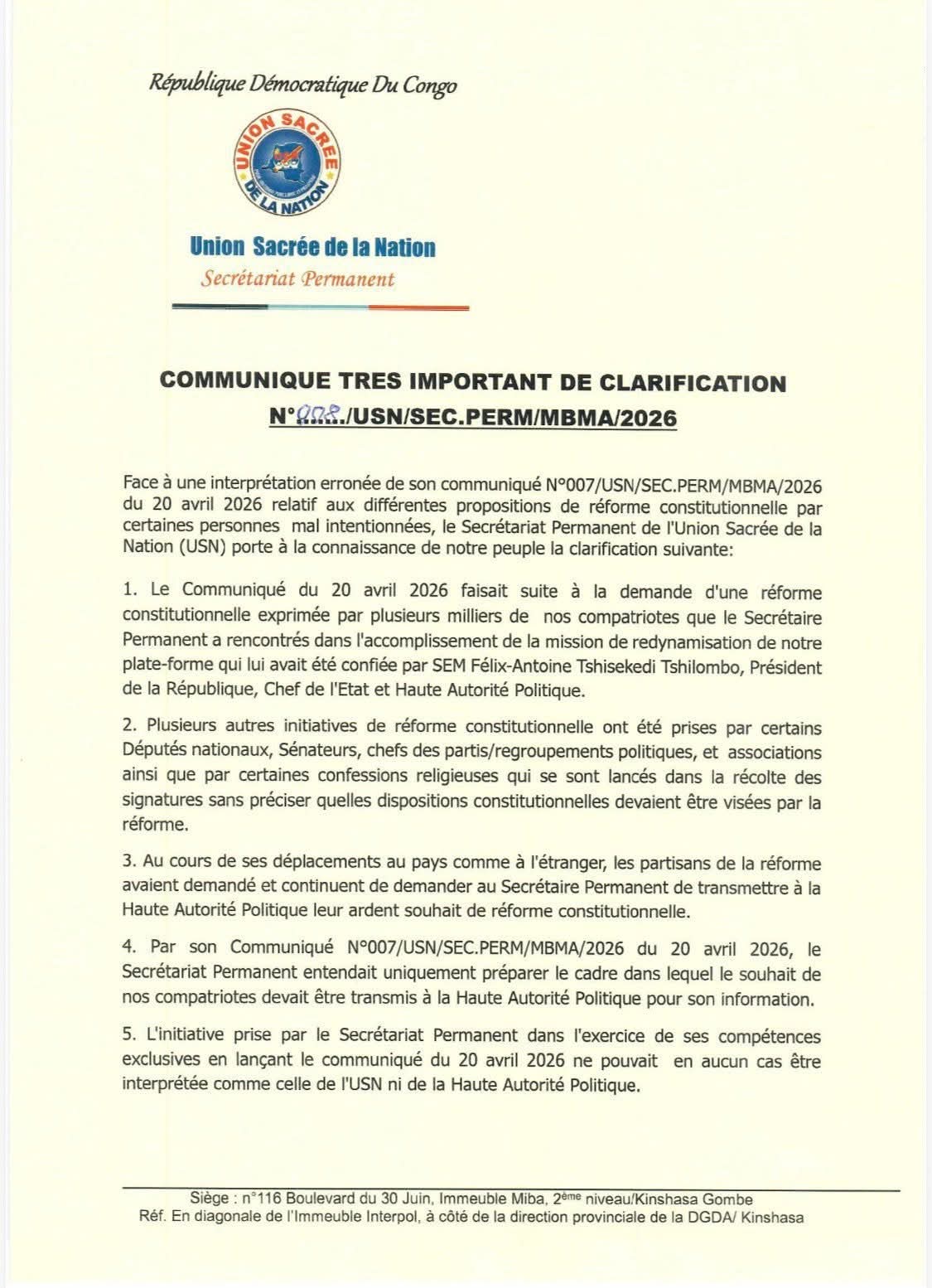 Le Secrétariat Permanent de l’Union Sacrée de la Nation (USN) a publié ce mardi 21 avril 2026 un communiqué visant à dissiper toute ambiguïté née de l’interprétation de son communiqué N°007/USN/SEC.PERM/MBMA/2026 du 20 avril 2026, relatif aux propositions de réforme constitutionnelle.