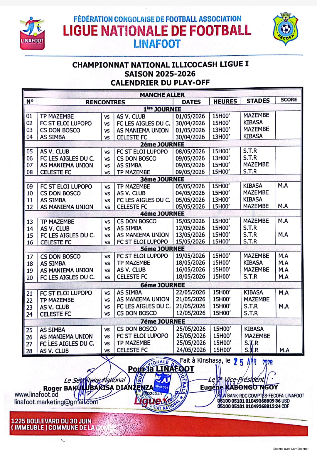 La Ligue Nationale de Football (Linafoot) a officiellement rendu public, ce Samedi, le calendrier tant attendu de la phase de play-off du championnat de Ligue 1 pour la saison en cours.